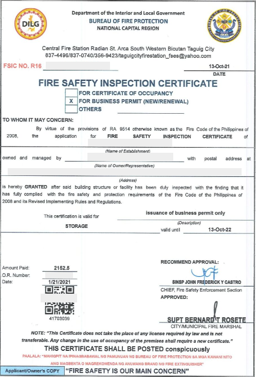 A Fire Safety Inspection Certificate or FSIC is a document issued to your business establishment by the Bureau of Fire Protection (BFP) attesting your structures and facilities have been duly inspected and are compliant with the fire safety standards under the Fire Code of the Philippines and other regulations. Read more about Fire Safety Inspection Certificate (FSIC) Application and Renewal >>>