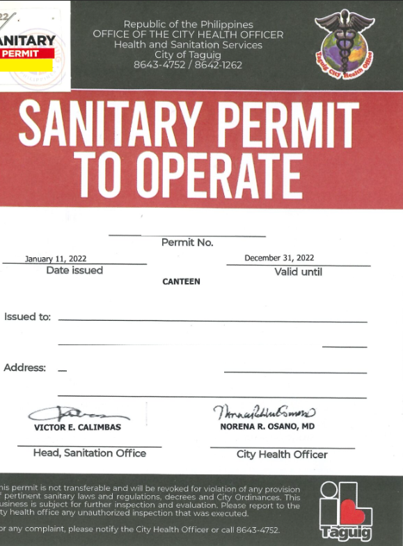 A Sanitary Permit to Operate, or simply a Sanitary Permit, is a mandatory business license issued by the LGU through its City or Municipal Health and Sanitation Department to certify that your establishment complies with the existing minimum sanitation requirements upon evaluation or inspection by a health officer or sanitary engineer in accordance with the Sanitation Code and local ordinances. Read more about Sanitary Permit Application and Renewals >>>